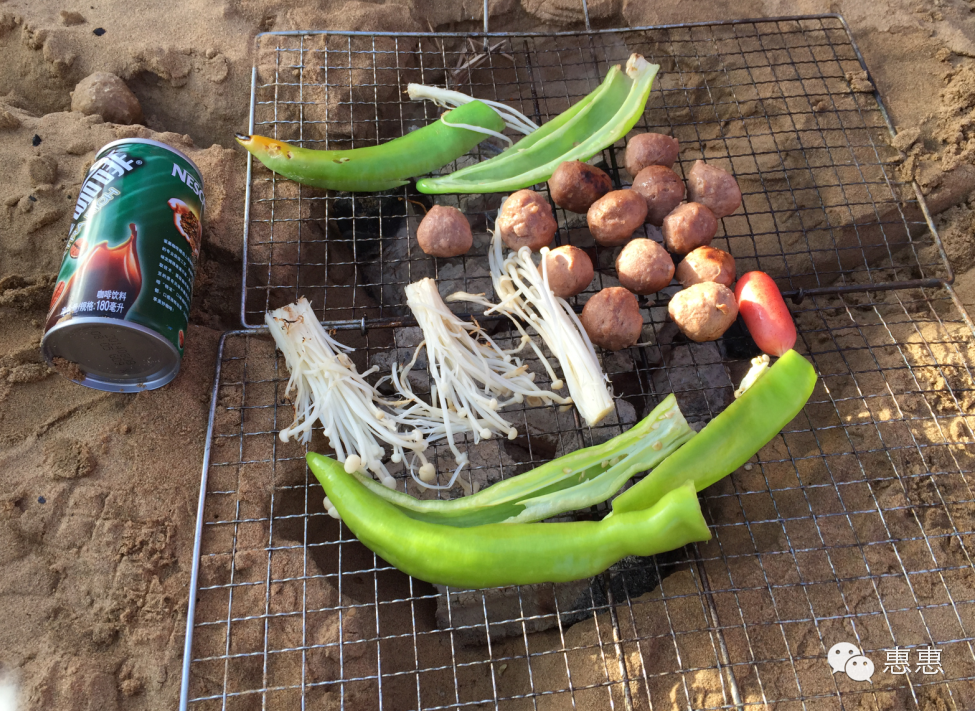 ! L# q9 S% I1 W9 ~, Y; {. i9 K在此,特别感谢小白背来的烤架和大碗茶背来的碳。在沙漠中生火,烤香肠,烤丸子,我们用工业气息浓重的食物,工具体验一种人类生活的原始模样。我闻着空气中燃烧的碳的味道,微醺,微醉,微内急。 6 l# F0 a$ }+ _+ e9 ~) A; y) Q' p